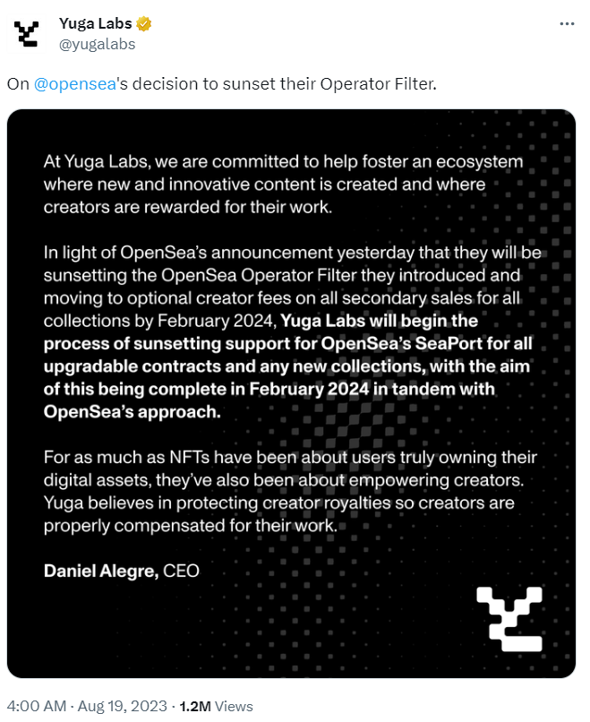 8 月 18 日,OpenSea 宣布从 8 月 31 日起执行可选版税,所有先前发行的 NFT 系列将在 2024 年 2 月 29 日后强制执行可选版税。
