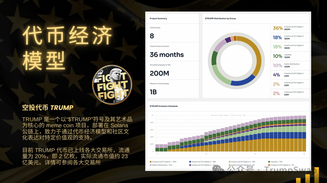 TRUMP 是一个以“$TRUMP”符号及其艺术品为核心的 meme coin 项目,部署在 Solana公链上,致力于通过代币经济模型和社区文化表达对特定价值观的支持。