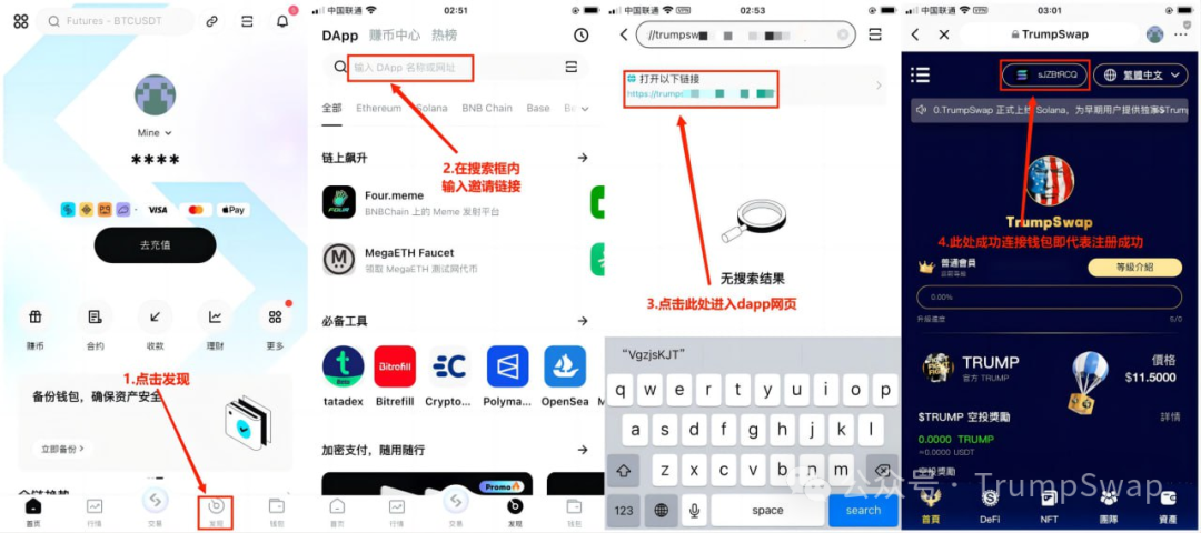 1. 打开钱包打开DAPP:HTTPS://TRUMPSWAP.VIP/?REF=8I7R43XF