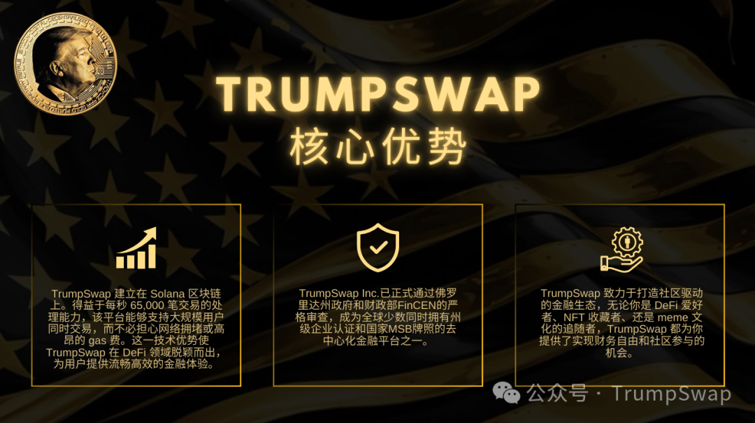 TrumpSwap的使命是通过创新的代币经济模型和社区文化,增强对DeFi和$Trump价值观的支持,为用户提供沉浸式参与全球金融生态系统的机会,实现财务自由。平台强调自由、隐私和自由交易的核心价值观,致力于为用户提供一个开放、安全、高效的去中心化金融平台。