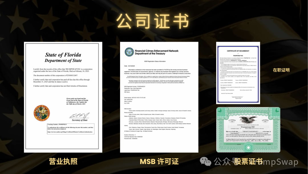 TrumpSwap已正式通过美国佛罗里达州政府及财政部金融网络(FinCEN)的严格审核,成功取得多项权威认证与牌照,所有智能合约及财务流程均通过第三方审计,严格遵循 FinCEN 监管要求,杜绝任何潜在风险。