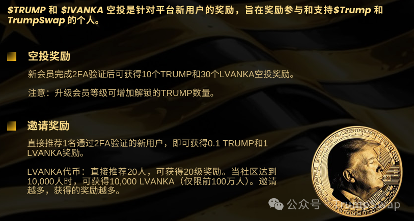 • 新用户注册:完成2FA验证,立即领取10枚TRUMP和30枚LVANKA代币。